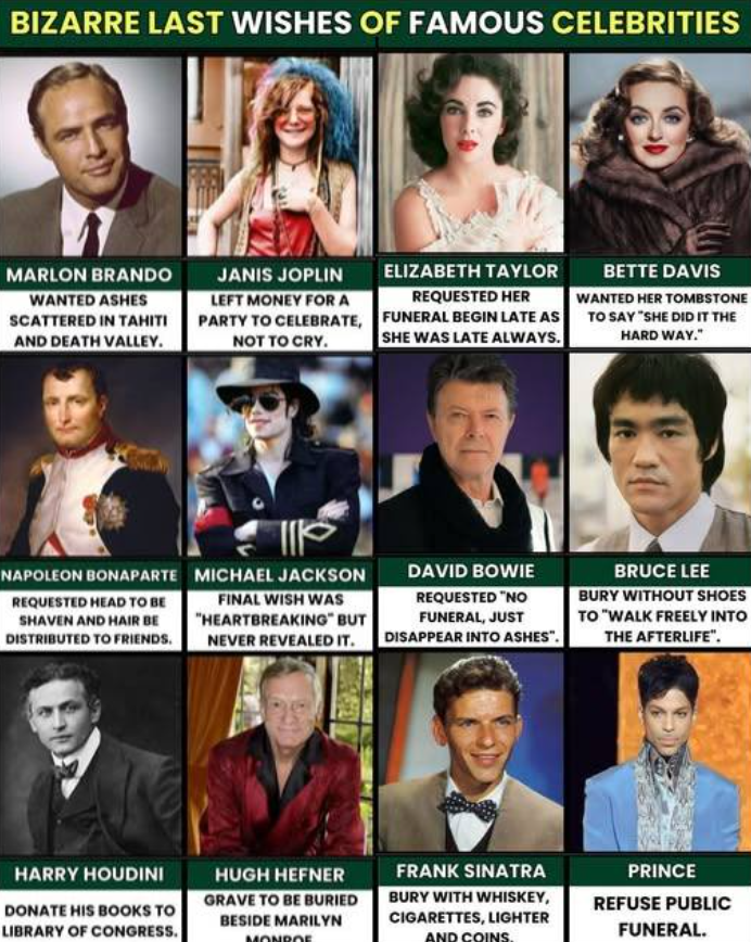 When it comes to their final wishes, many celebrities have expressed unique, and at times bizarre, desires for how they want to be remembered or how they want their legacies to unfold. From elaborate funeral requests to eccentric burial wishes, these stars had some unconventional thoughts about life after death. Here’s a look at some of the most bizarre final wishes of famous celebrities.