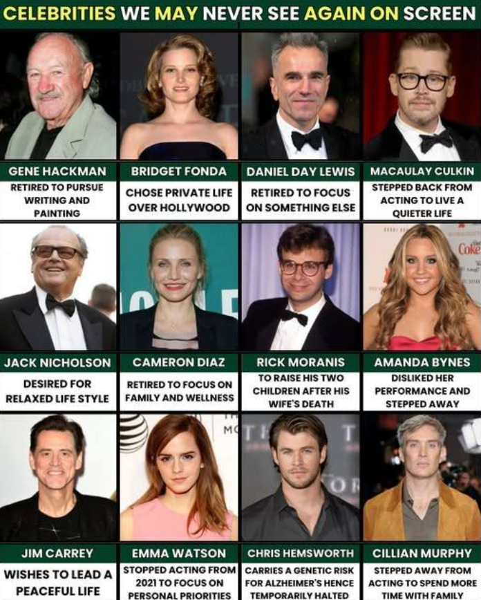 The entertainment industry may never be the same without these iconic stars, but their choices reflect a growing trend of celebrities prioritizing personal peace, family, and health over fame. While we may not see them on screen again, their legacies in film and television continue to inspire and entertain us. Sometimes, the best role an actor can take on is the role of being true to themselves.