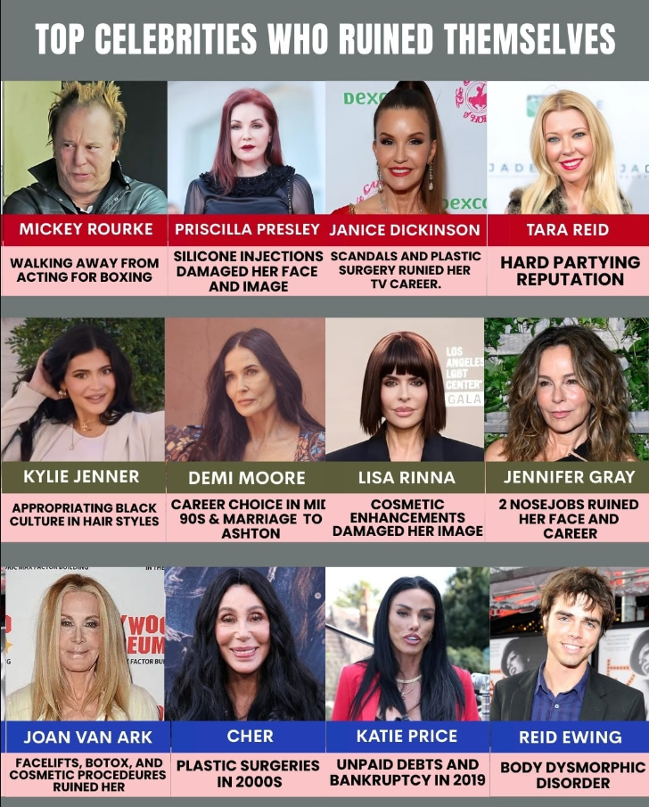 In the world of fame and fortune, not every celebrity is able to maintain their success or reputation. Some have made decisions that led to major career or personal setbacks, from damaging cosmetic procedures to poor life choices. Here’s a look at some of the most iconic celebrities who ruined their own careers or image.