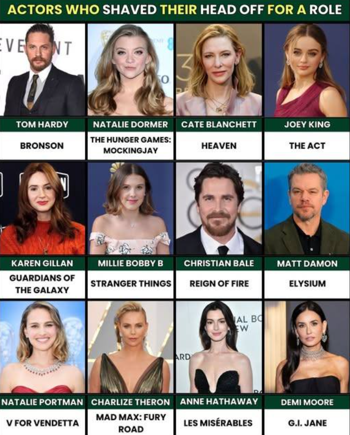 Shaving their heads wasn’t just a cosmetic choice for these actors—it was a powerful storytelling tool. By sacrificing comfort and traditional beauty standards, they delivered performances that felt authentic, brave, and unforgettable. These transformations remind audiences that true acting often begins where vanity ends.