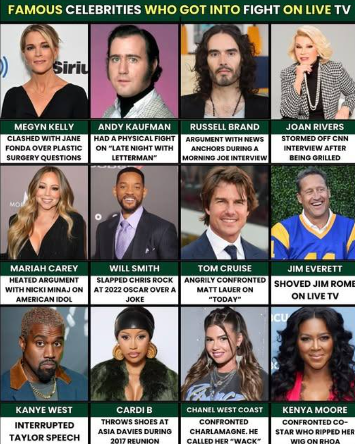 Throughout the years, several high-profile celebrities have made headlines not only for their careers but for their unforgettable moments of conflict on live television. Whether it was heated arguments, physical altercations, or intense confrontations, these moments often left viewers shocked and added an unexpected twist to the public persona of the stars involved. Let’s take a closer look at some of the most famous celebrity fights on live TV, as highlighted in the image:
