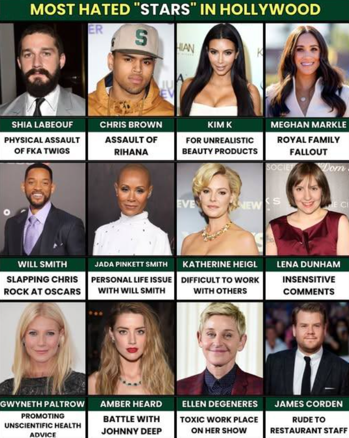 Hollywood has seen its fair share of stars who, despite their fame and talent, have attracted significant public criticism. Whether due to personal missteps, professional conflicts, or perceived problematic behavior, certain celebrities have become some of the most hated figures in the entertainment industry. Here’s a look at the celebrities featured in the image and the reasons behind their public backlash.