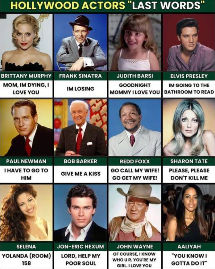The final words of famous actors and entertainers often capture a moment of intense emotion and provide a glimpse into their final moments. Below is a reflection on the last words of several Hollywood icons, known for their contributions to film, television, and music.